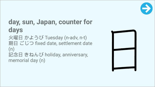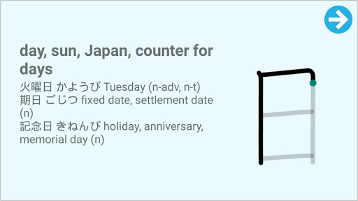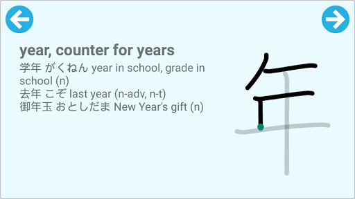 Study with flashcards, memory cards ,customizable quizzes and writing challenges. Each kanji has detailed information and many examples.