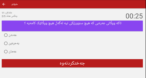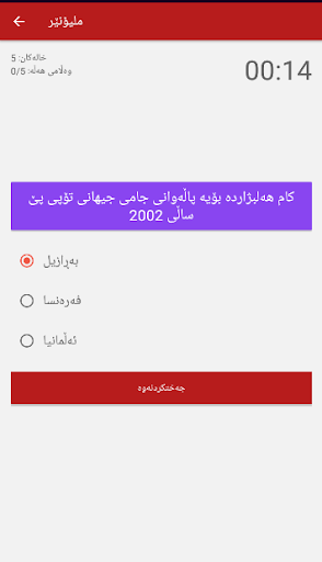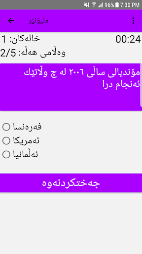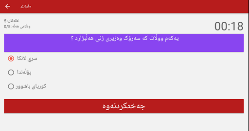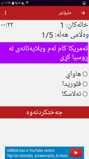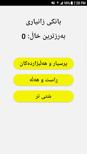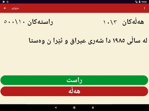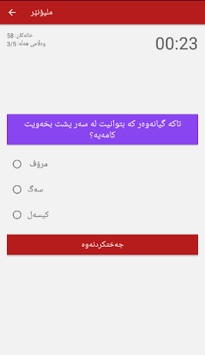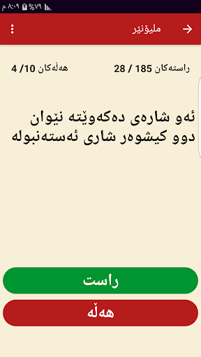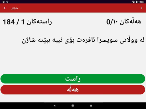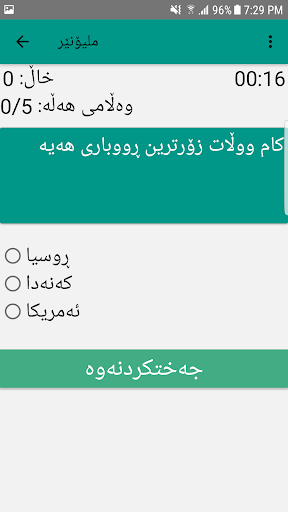 لەگەڵ ئەم بەرنامەیەدا ئەتوانیت ئاستی زانیارێکانی خۆت تاقی بکەیتەوە و بزانیت ئاستی زیرەکیت و زانیارێکانت لە چ ئاستێکدایە .پرسیاری لە هەموو بوارێک تیایە