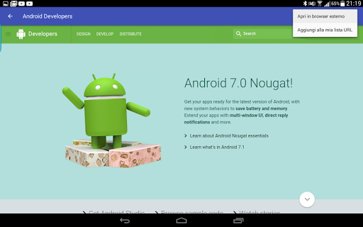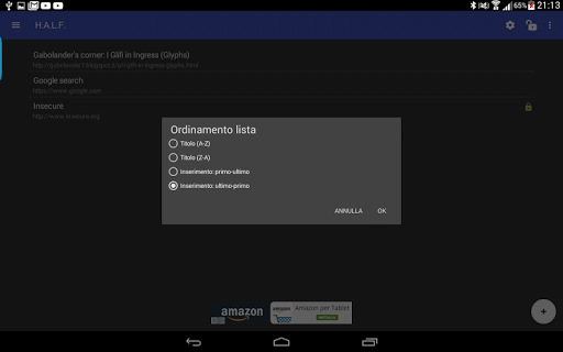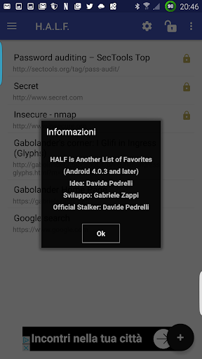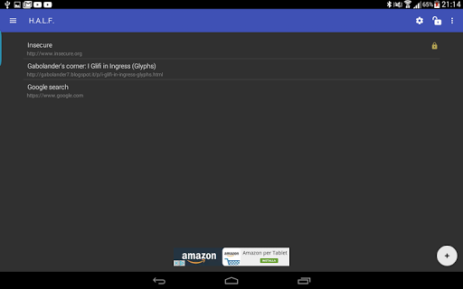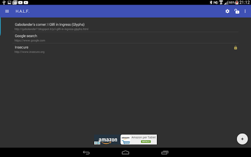 I vostri link preferiti, possono essere aperti per default in un browser interno dell'app, ma in ogni istante potete trasferire il contenuto che state visualizzando verso il vostro browser preferito o preinstallato, e potete aggiungere la posizione che state visualizzando alla lista dei vostri link preferiti, sia dal browser incorporato dell'app, sia da un'altro browser esterno, condividendo il link verso HALF.