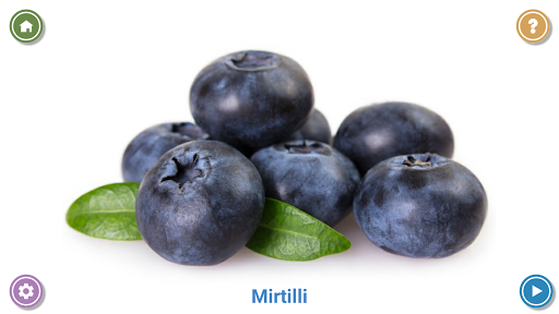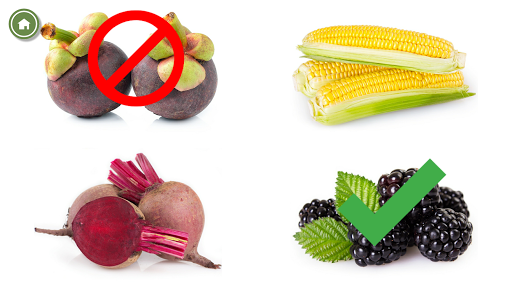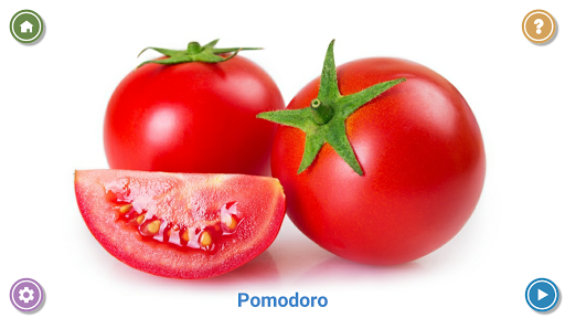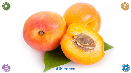 Dopo l'apprendimento dei frutti l'applicazione offre di verificare le conoscenze. Mostra 4 diverse foto e pronuncia il nome del frutto / verdura. Un bambino deve toccare la foto corretta. È molto divertente e anche buono per la memoria!