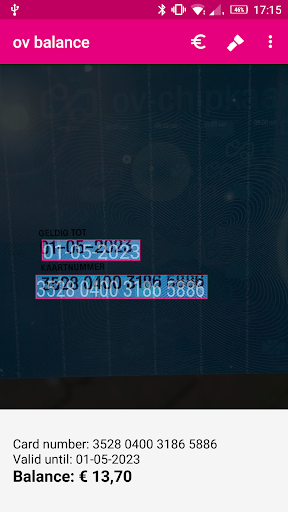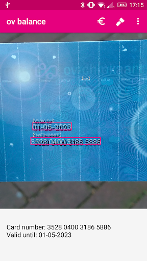 The ov balance checker can check the balance of your Dutch anonymous ov-chipcard. Point your device's camera at the ov-chipcard and the app will show the card's balance: the app recognizes the card number and the expiry date and uses those to look up the balance at ov-chipkaart's website.