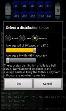 -Gaussian or Bell Curve mode assigns an average and variation that will be approximately 95% accurate. The individual average and variation can be assigned by the user. For example when using a d10 and the user sets the average to be 7 with a variation of 2 the roller will roll between 5 and 9 95% of the time.