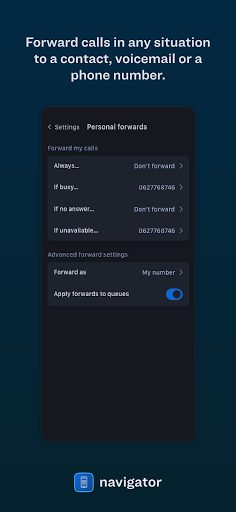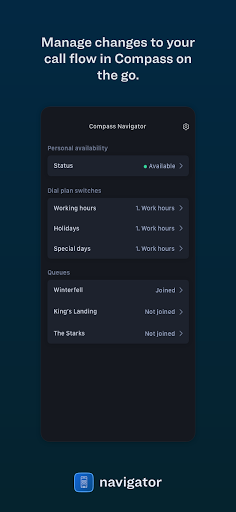 Controlla la tua bussola PBX da qualsiasi luogo.Con questa app scegli il tuo numero in uscita, configurare le chiamate in avanti, accedi e disconnetti le code e controlla gli switch virtuali nel tuo dialplan.