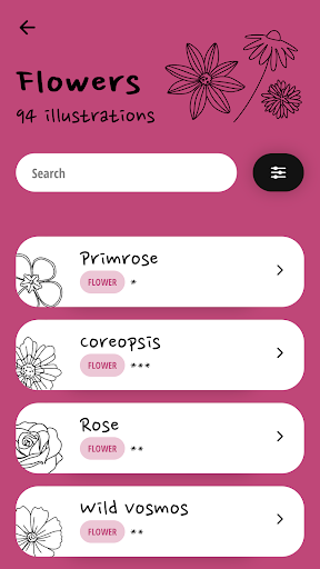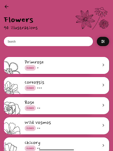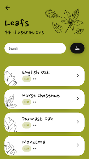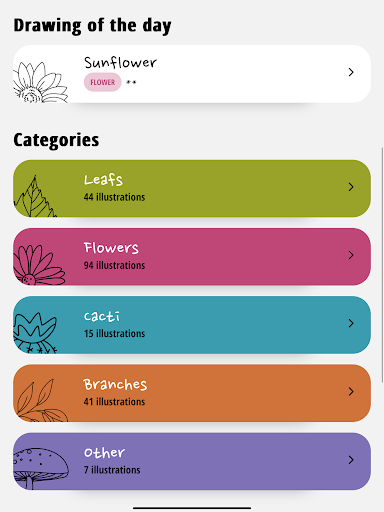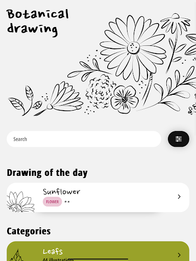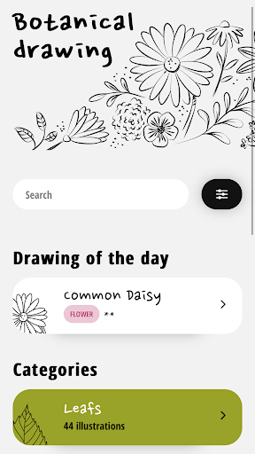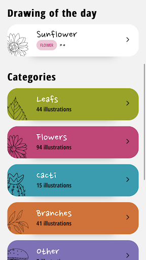 È inclusa una vasta collezione di botanici in diverse categorie, come foglie, fiori e cactus.La collezione di fiori comprende rose, tulipani, girasoli, magnolia, dente di leoni, narciso, margherite, dahlia, fiori di fiori e molte altre piante.Le categorie di foglie e rami includono quercia, ginkgo, monstera, olive, cedro, pino, ramoscello e altri alberi ben noti.Inoltre, puoi imparare a disegnare cactus, piante grasse, scaglie di neve e funghi.L'app contiene felici illustrazioni simili a doodle, ma anche molti disegni di linea botanica realistici.