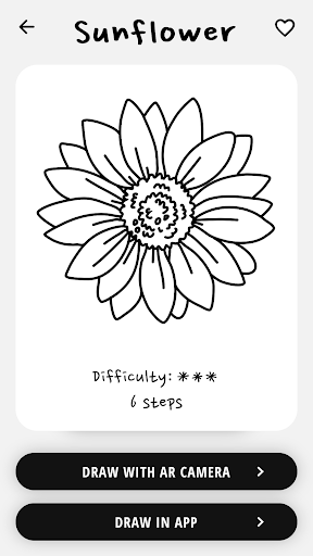 Questa app di disegno di linea botanica supporta due modalità di disegno.È possibile disegnare l'app sullo schermo del dispositivo, ma è forse più divertente attivare la modalità di disegno AR.In questo modo puoi facilmente tracciare le linee sulla carta usando la fotocamera del dispositivo.Guarda lo schermo e segui facilmente la guida al disegno passo-passo per creare un divertente arte botanica.