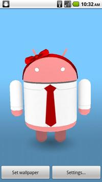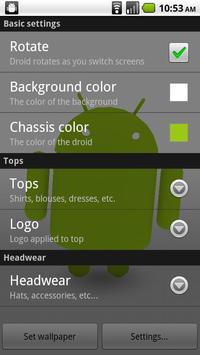 Pimp My Droid is a interactive animated 3D wallpaper. You can customize your own android with pants, shirts, hats and more. Touch the android and you will be greeted with different animations. When not entertaining you the droid still moves around. Periodic updates will bring new animations, clothing, items and features.