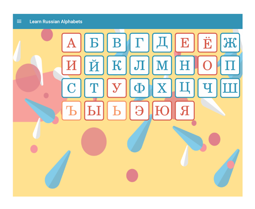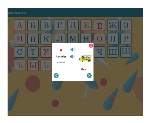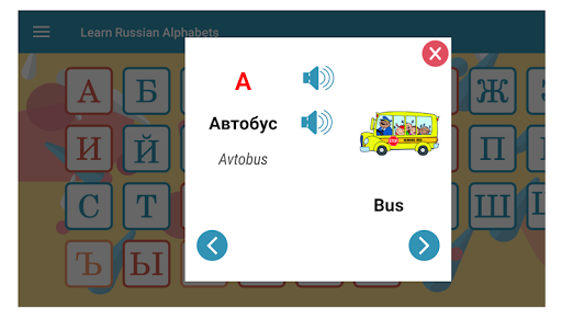 Questa app Android è il modo più semplice e divertente per imparare l'alfabeto russo con immagini e voce. Può venire a portata di mano se vuoi anche imparare la lingua russa. Godranno sicuramente questa app perché mostrerà un'immagine colorata per ogni parola e possono anche sentire la voce di un madrelingua mentre attraversano ogni lettera dell'alfabeto russo.