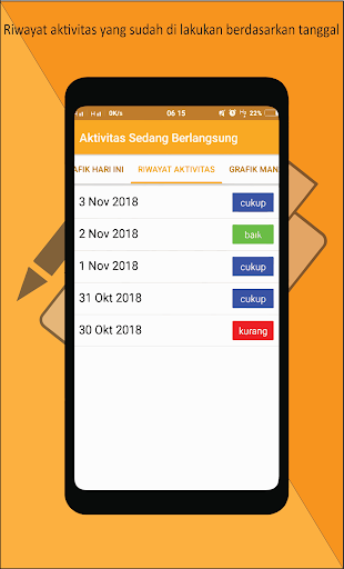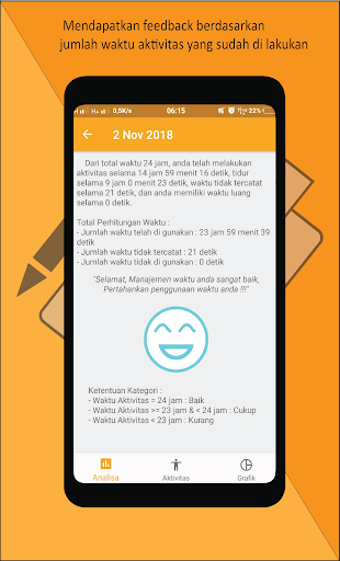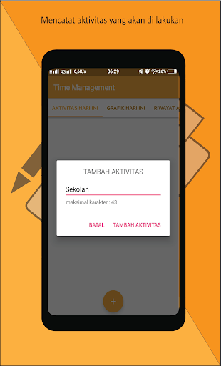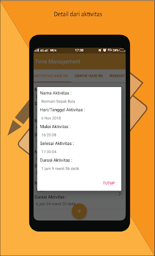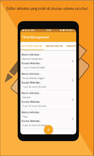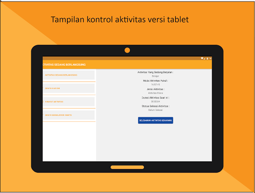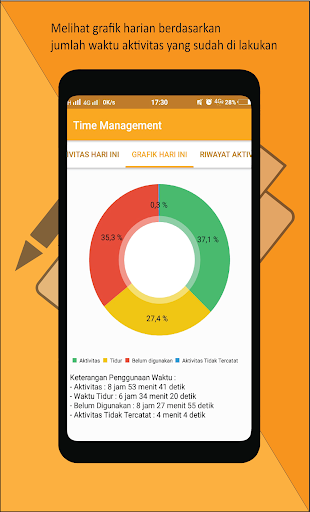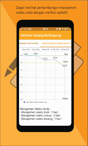 Mencatat aktivitas, kontrol aktivitas, grafik harian, riwayat aktivitas dan statistik manajemen waktu.