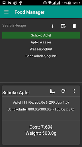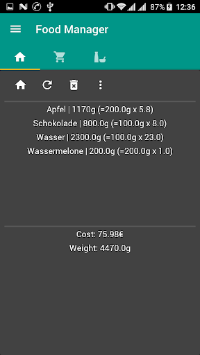FoodManager Dochiamo i tuoi prodotti alimentari che hai a casa.Sulla base di questi elementi è possibile definire le ricette e sapere sempre quali ricette puoi cucinare in base agli elementi disponibili.Ottieni automaticamente le statistiche sulla ricetta per esempio quanto costa e pesi.