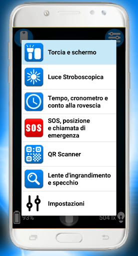 Torcia e display, luce stroboscopica, tempo / cronometro, SOS, scanner QR, lente d'ingrandimento e specchio.
