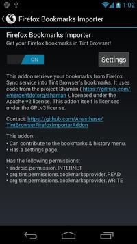 This addon retrieve your bookmarks from Firefox Sync service into Tint Browser's bookmarks. It does *NOT* sync back your bookmarks from Tint Browser to Firefox Sync.