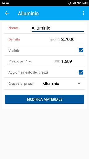 L'applicazione calcola il prezzo dell'articolo (ad es. Tubo) in base ai prezzi dei materiali