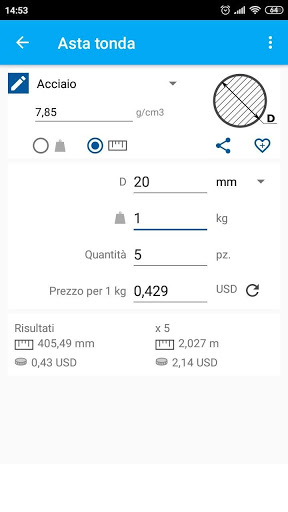È possibile effettuare calcoli utilizzando il materiale scelto (ad esempio argento, alluminio) e il proprio