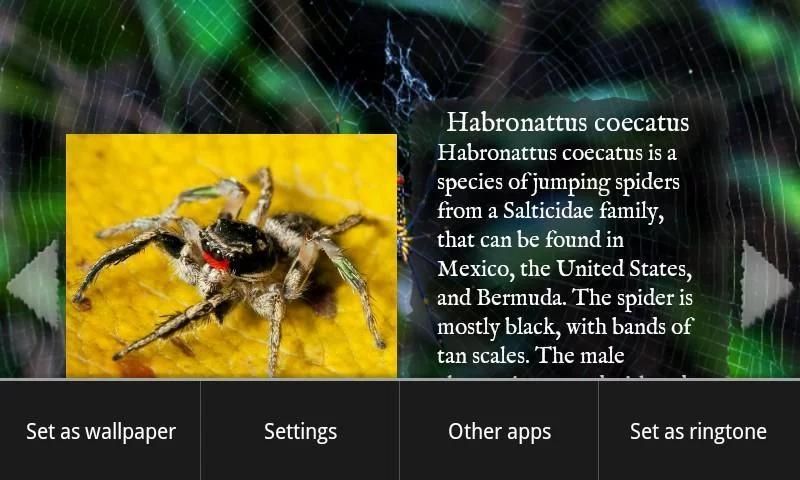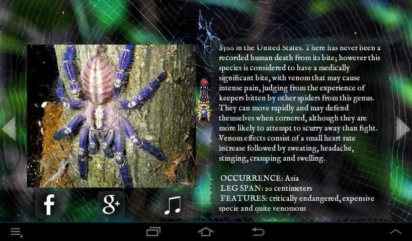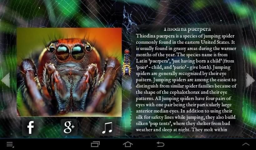 Best Spiders application contains over twenty different pictures of arachnids, accompanied by creepy music and interesting information from the most reliable sources. You can also set a chosen image as a wallpaper. Twenty four unique spiders just can’t wait to be discovered – so download Best Spiders to see these amazing creatures!