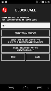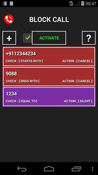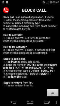 Block Call is an android application. It use to 1. Silent the incoming call alert from exact number or related match by type. 2. Cancel the incoming call from exact number or related match by type.