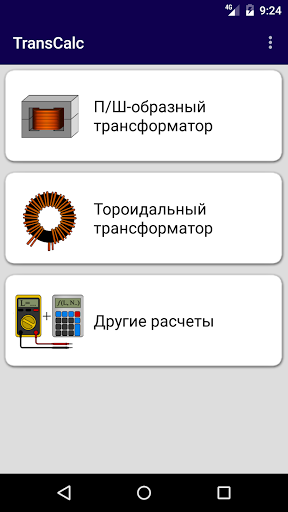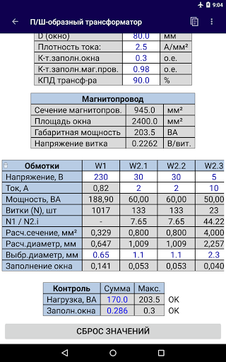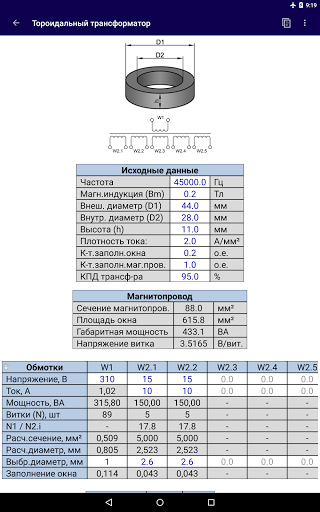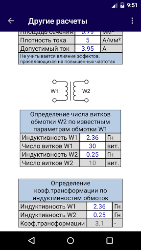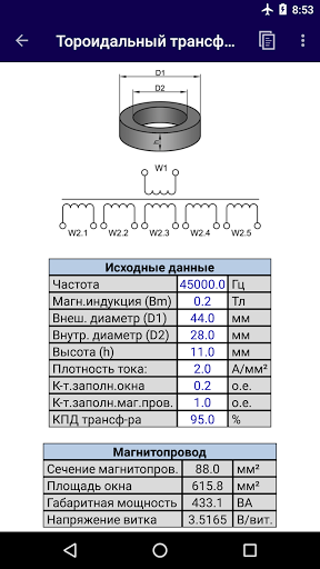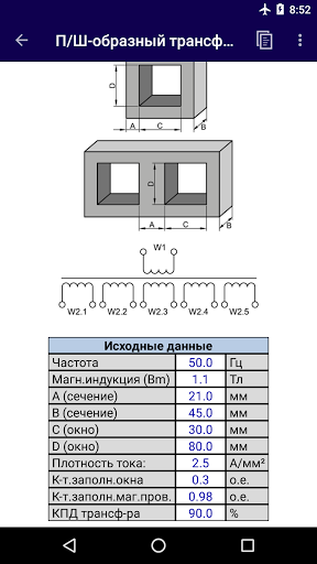 Semplice calcolo del trasformatore di tensione in base ai parametri della conduttura magnetica, tensioni specificate e correnti di avvolgimenti. I calcoli possono essere fatti per trasformatori blindati, asta e toroidali. I dati di origine sono inseriti dall'utente nella tabella. Con l'attività corretta di tutti i dati di origine, il calcolo e l'output dei risultati si verifica automaticamente. I calcoli sono applicabili ai trasformatori a bassa potenza che si nutrono della corrente sinusoidale della bassa frequenza. Nella sezione "Altre calcolazioni" ci sono semplici calcoli ausiliari: resistenza e lunghezza del filo; calcolo della sezione trasversale della corrente; Calcoli utilizzando dati di induttanza.