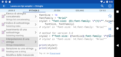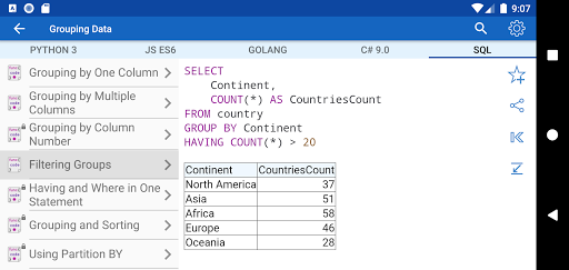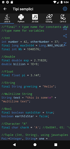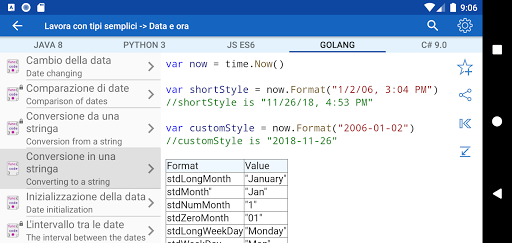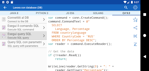 ✓ Non sai quale linguaggio di programmazione scegliere? L'applicazione può confrontare la sintassi di ogni esempio in diversi linguaggi di programmazione e prendere una decisione equilibrata durante la scelta di un linguaggio di programmazione.