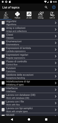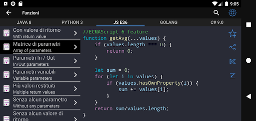 ✓ L'applicazione è un buon strumento durante l'esame o la preparazione al colloquio perché contiene un riferimento alle operazioni di uso frequente in diversi linguaggi di programmazione.