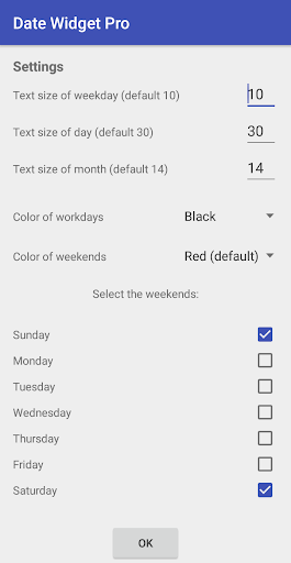 nelle impostazioni È possibile impostare la dimensione del carattere per la data, giorno della settimanae mese.
