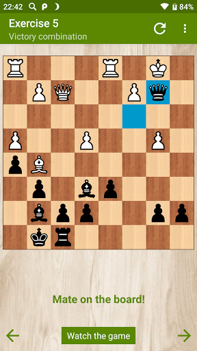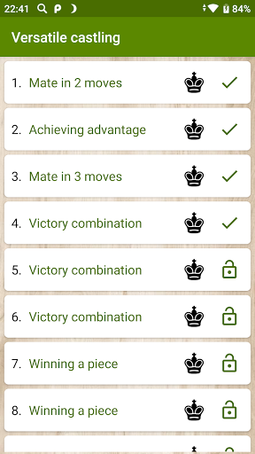 La versione gratuita contiene 27 interessanti esercizi sulle combinazioni di vittoria, ottenendo un vantaggio, vincendo pezzi e accoppiamento in poche mosse.Nella versione completa dell'applicazione, 172 attività ti aspettano.