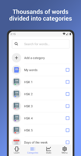 • 5000 parole vocabolario. Migliaia di parole e frasi cinesi divise in categorie tematiche, compresi i livelli HSK 1-6. Scegli la categoria che desideri imparare questa volta e cambiarla quando vuoi.