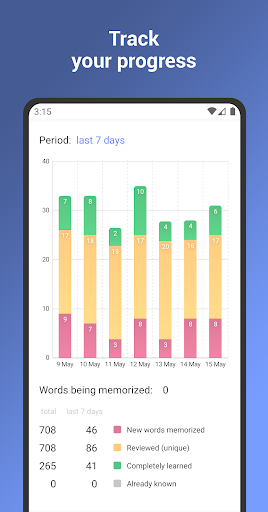 Utilizzare l'app almeno due volte al giorno, con rotture regolari ogni poche ore. Inizia con solo cinque parole al giorno e avrai almeno 1.825 nuove parole nel tuo vocabolario attivo entro un anno. Aumenta il tuo obiettivo quotidiano, prendi più lezioni cinesi, e accelerai i tuoi progressi e imparate i cinesi ancora più velocemente.