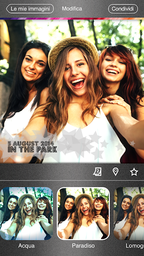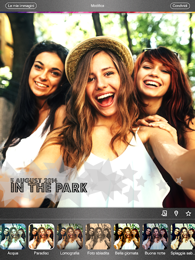 Puoi usare le app social e di messaggistica installati nel tuo dispositivo, email o MMS per condividere le tue immagini con gli amici che potrai impressionare anche usando uno dei filtri che l'app mette a disposizione.