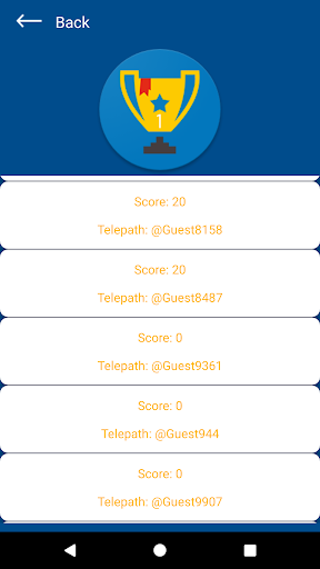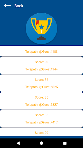 Alla fine di ogni partita, se lo desideri, puoiMostra il tuo punteggio del telepath a "The TelePath App" Community.Chiediamo solo un nome utente alla fine di ogni gioco che vuoi mostrare alla comunità e non deve essere sempre lo stesso nome utente.