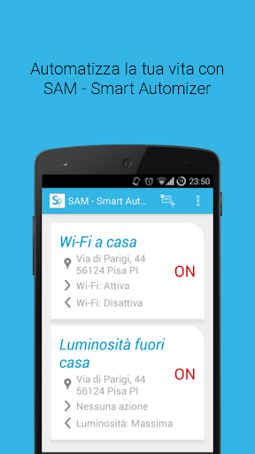 Con #SAM puoi gestire automaticamente il Wi-Fi, Bluetooth, GPS, Luminosità, far suonare allarmi, visualizzare una notifica e lanciare un'app a tua scelta. Cosa vuoi di più?