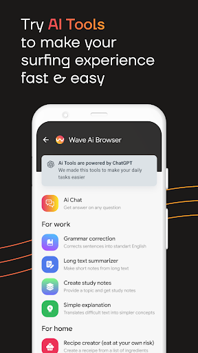 Intelligent Search Engine: With the Wave AI Browser, you'll encounter an intelligent and personalized search engine that goes beyond traditional methods. Powered by advanced AI algorithms and ChatGPT it offers enhanced suggestions and predictions, making your searches faster, more accurate, and tailored to your interests. Discover relevant information effortlessly and witness the power of AI at your fingertips.