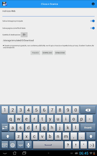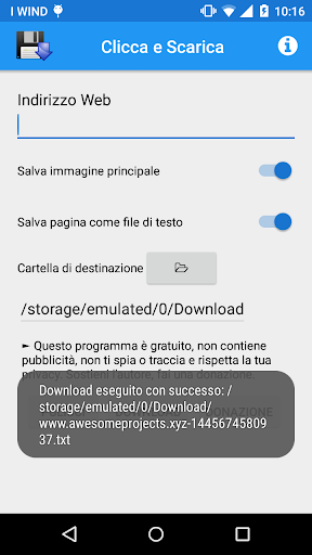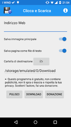 Quando navighi da casa usando il PC, hai la possibilità di scegliere di salvare la pagina o la foto che stai visualizzando, questa operazione è a volte difficile o addirittura impossibile da fare usando gli smartphone o i tablet. "Clicca e Scarica" ti aiuta a risolvere il problema, avviando l'applicazione è possibile scrivere l'indirizzo Web della pagina che si vuole salvare oppure se si sta