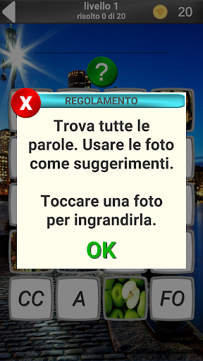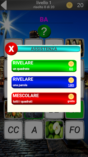 Attenzione!!! L'aggiornamento dalla versione 1.0.5 alla versione 1.0.6 comporterà la perdita dei progressi di gioco!!!! Nella versione 1.0.6 abbiamo aggiunto premi per la visualizzazione degli annunci, riscritto la logica del gioco e aggiornato la grafica.In questo gioco ci sono 620 parole e tante immagini. È necessario indovinare la parola nella foto. In fondo le parole sono usate nella vita quotidiana, ma ci sono quelli che si incontrano raramente nella conversazione quotidiana. Il vostro compito è quello di indovinare la parola mostrata nella foto. Il gioco promuove lo sviluppo del pensiero logico. Godetevi la vostra vacanza.