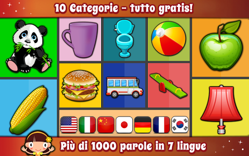 Bambino prime parole comprende 150 parole in 7 lingue - inglese, italiano, tedesco, francese, cinese, coreano e Japnese. flashcard bambino li aiuterà ad imparare oggetti di uso quotidiano.