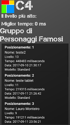 C4 dispone di un quadro di valutazione globale al quale puoi inviare il tuo punteggio (livello raggiunto e tempo necessario) in modo da poter controllare il confronto con altri giocatori.