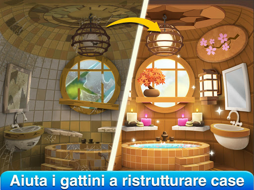 • Guadagna premi bonus quando completi il restauro, il rinnovamento, la decorazione e la progettazione delle tue adorabili casette per gatti.