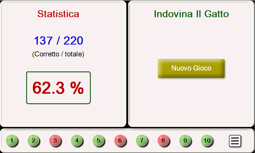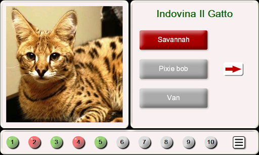 Il gioco “Indovina la Razza di Gatti” è un divertente quiz. Tra 3 opzioni devi scegliere la razza del gatto, che è indicato nella foto. Le risposte corrette sono indicate in verde, e gli errori da incorretta in rosso, Per ogni risposta corretta riceverà 1 punto. Dopo che si indovina 10 immagini, sarete in grado di vedere le statistiche –numero di risposte corrette e il numero di tutte le immagini, e anche la percentuale di risposte corrette del numero totale di immagini di gatti.