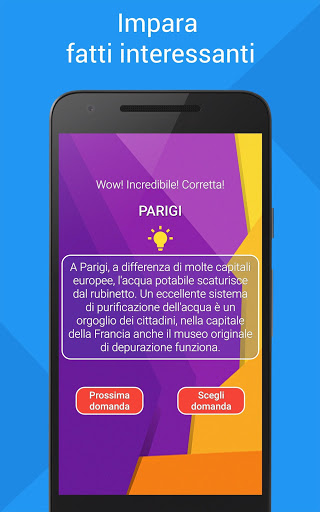 Indovina il maggior numero possibile di paesi e città e guadagna monete. Dopo ogni domanda nel quiz segue un fatto interessante sul paese o sulla città. Questi fatti apriranno il mondo e la geografia per voi sul nuovo lato. Abbiamo raccolto molti fatti interessanti nella nostra applicazione, quindi fai uno di quelli che conoscono quasi tutto ciò che riguarda le attrazioni, i paesi e le città. Se siete bloccati ad un livello difficile per te e non conoscete la risposta - puoi sempre prendere un suggerimento.