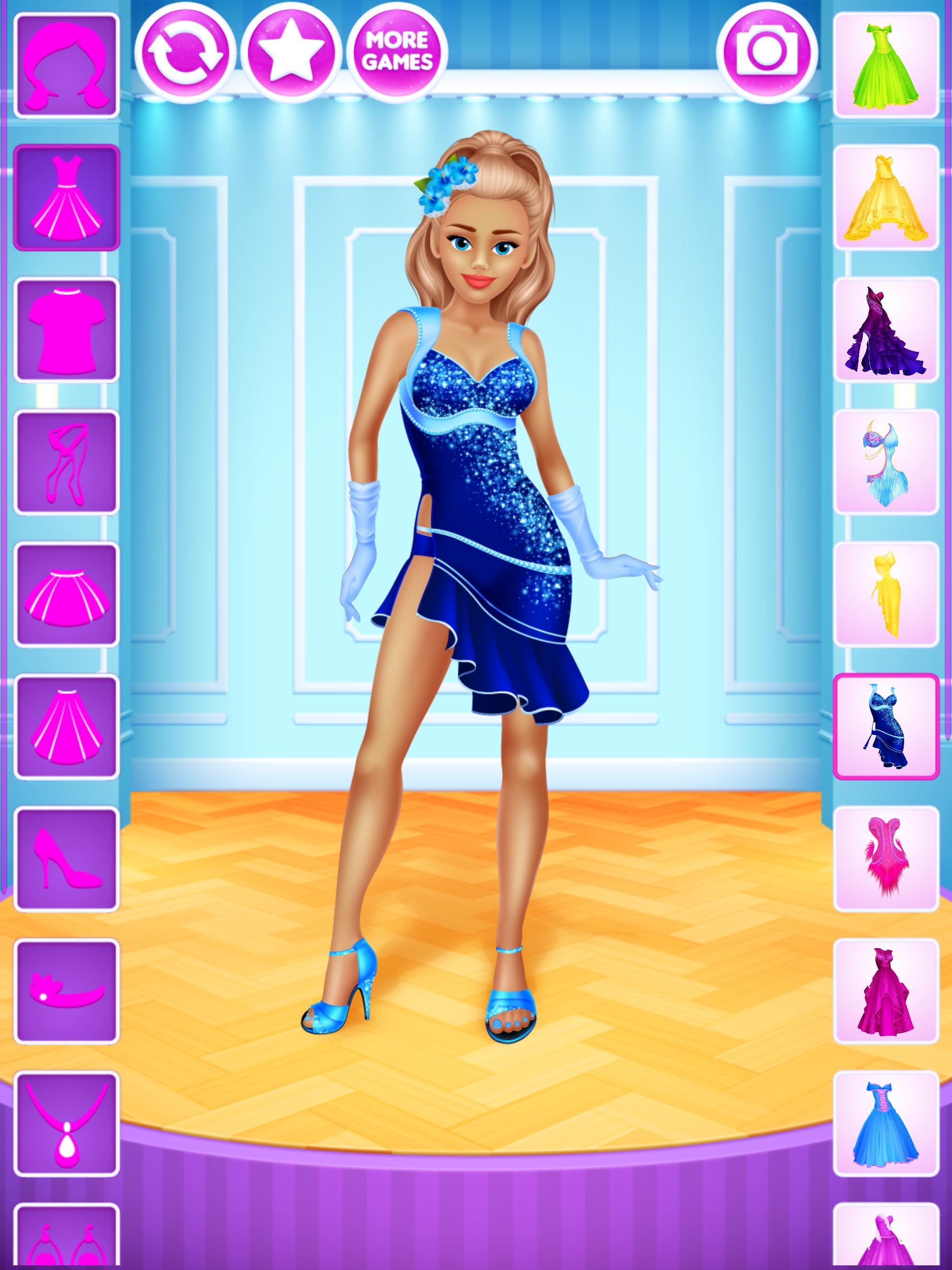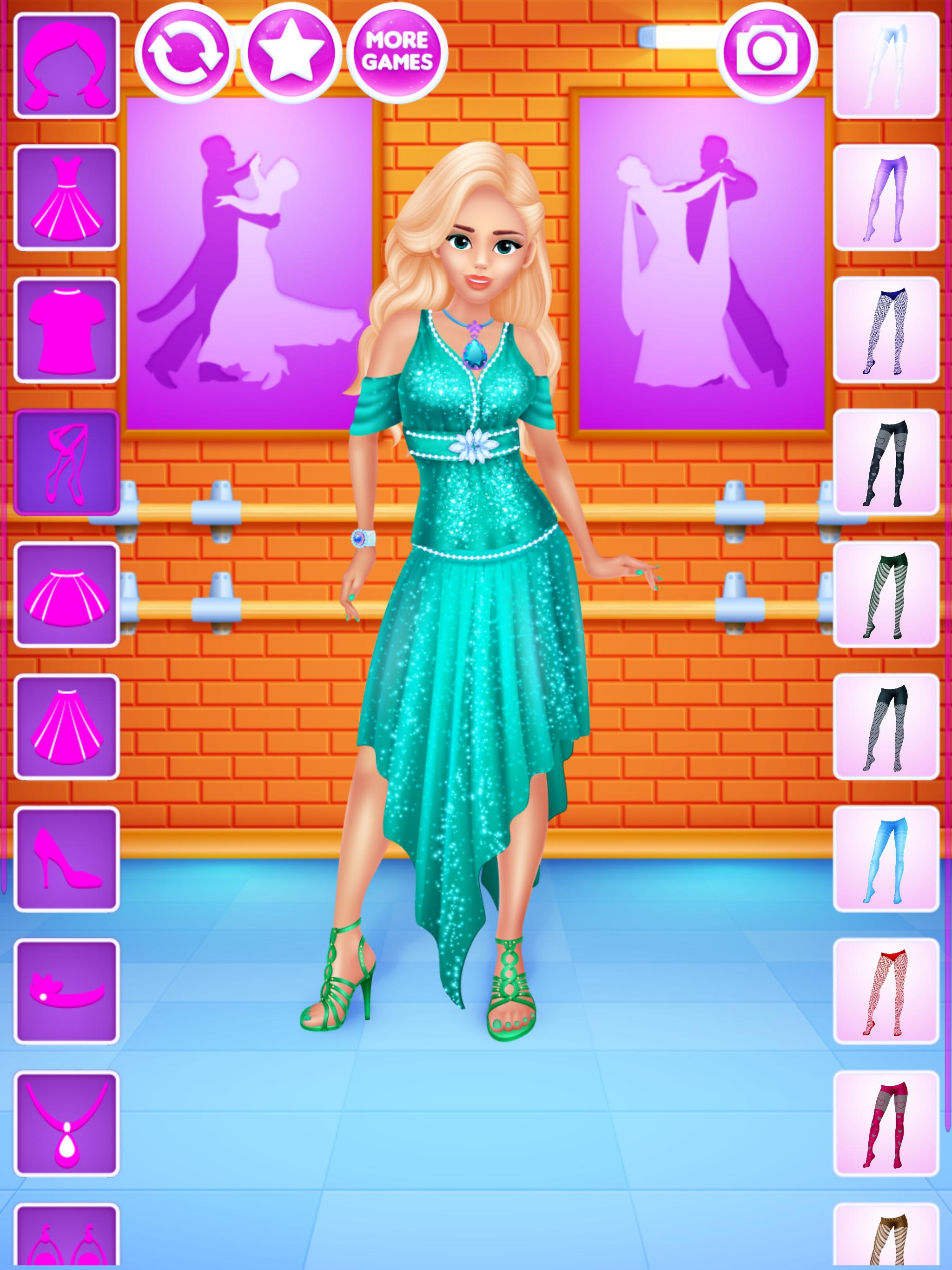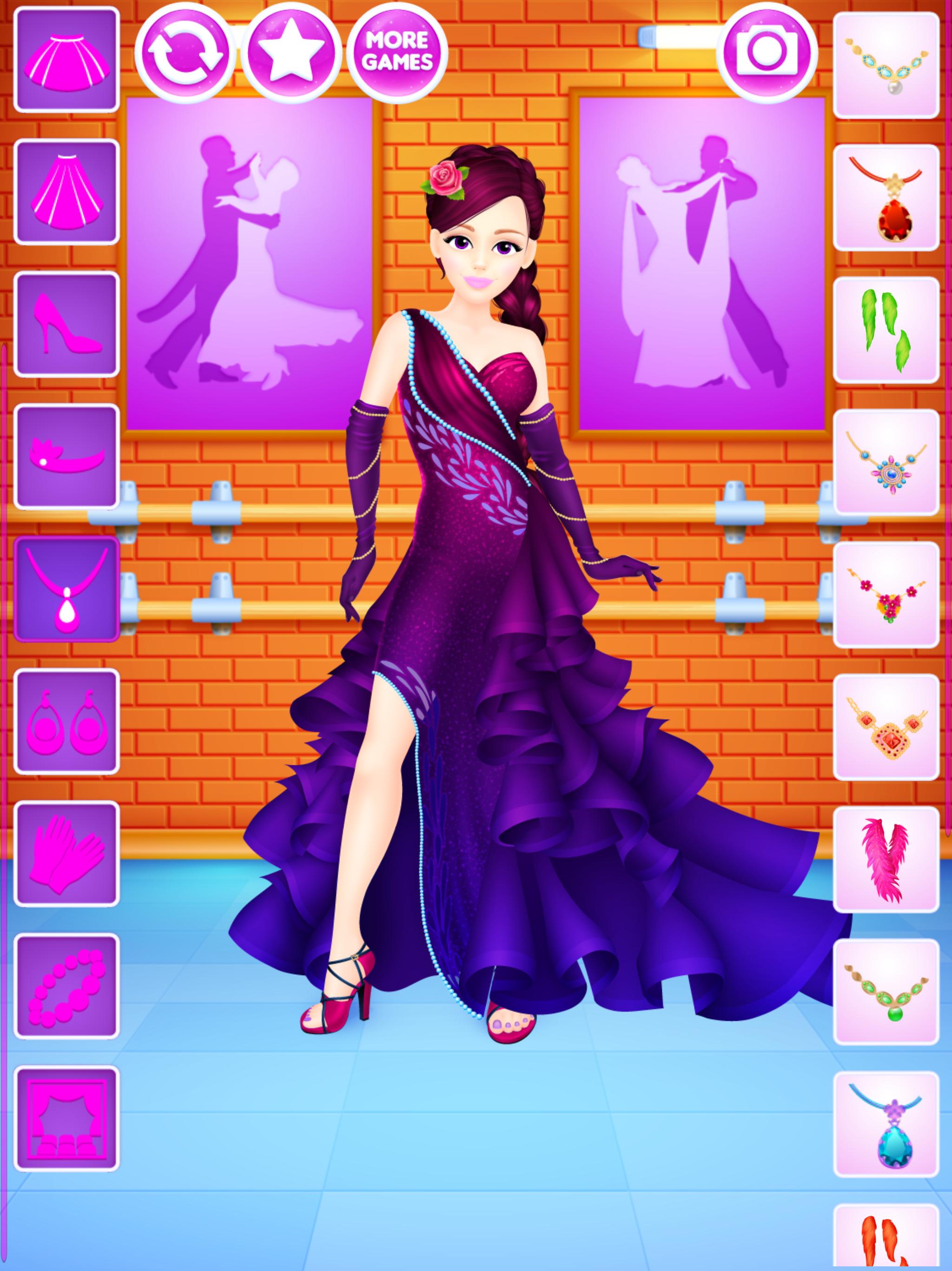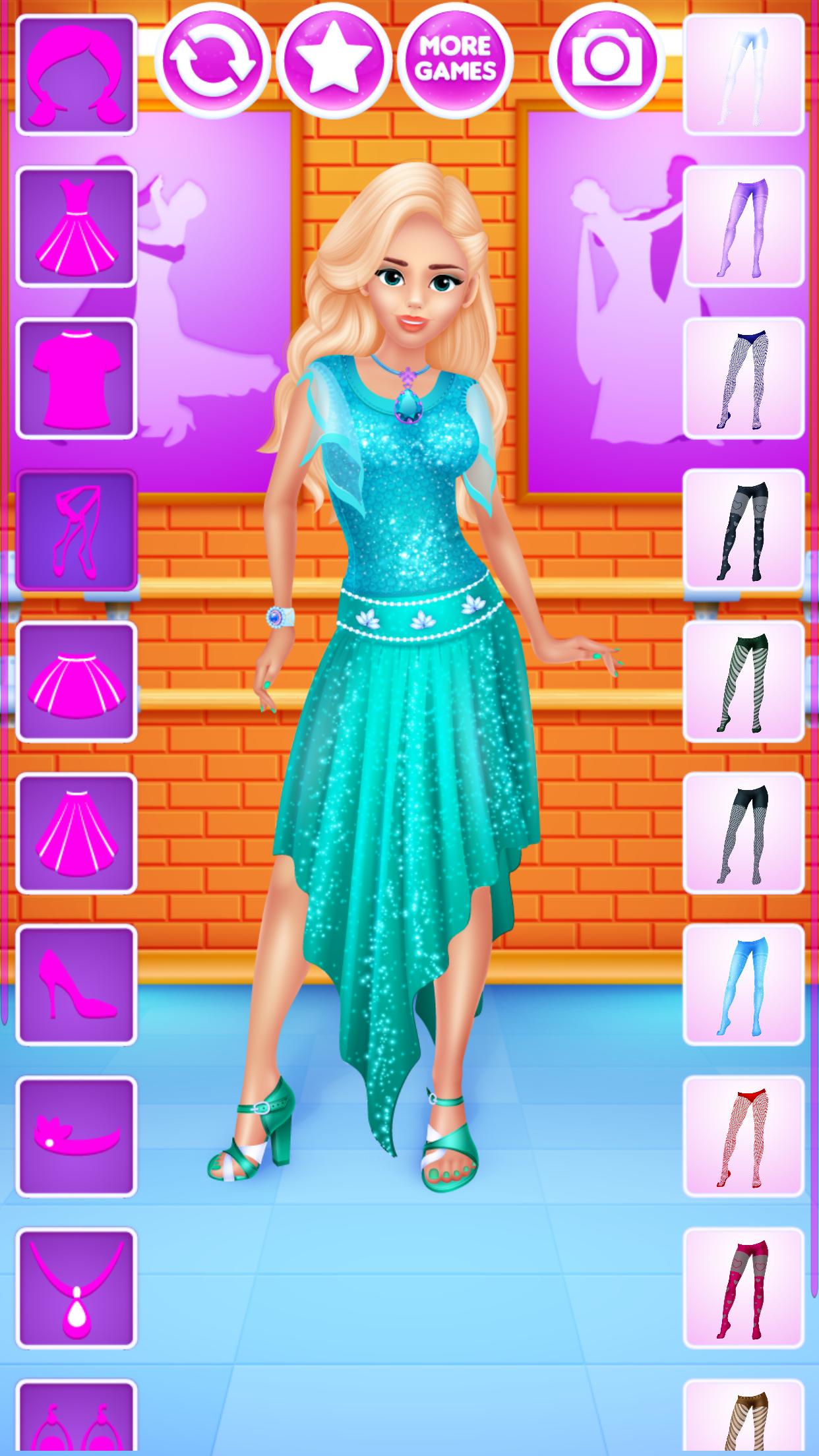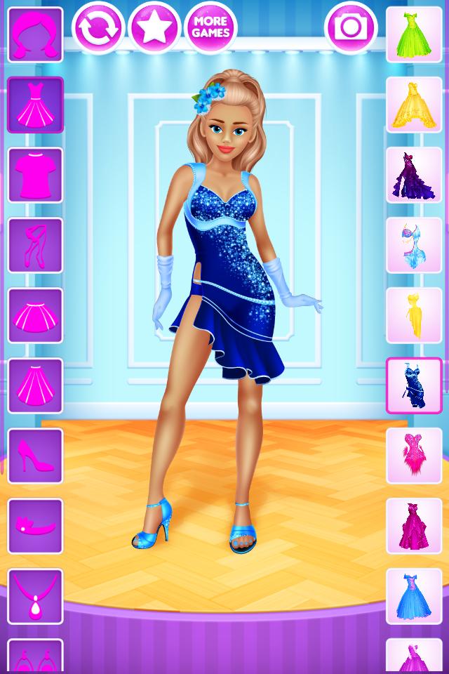 For all girls who love dancing this dressup game gives a chance to design outfits for various kinds of dances. 6 dolls to dress up, on 4 backgrounds and, most importantly, with over 200 clothing items, accessories and hairstyles to choose from. All of that is completely free, without any locked items, in-app purchases or similar annoyances.