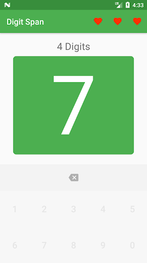 Il test della cifra è utilizzato per misurare la capacità di archiviazione del numero della memoria di lavoro.Verrà visualizzata una serie di cifre numeriche, dopo di che ti verrà richiesto di richiamare la sequenza.Dopo ogni tentativo di successo, il numero di cifre è aumentato di uno.Dopo ogni tentativo fallito, il numero di cifre è diminuito da uno, e una vita è persa.Dopo che tre vite sono perse, il più alto tentativo di successo conterà come la tua cifra.