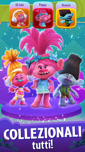 • Colleziona i tuoi Troll preferiti: Raccogli gli adesivi per aggiungere Poppy, Branch, DJ Suki e tantissimi altri alla tua Collezione Troll e fate esplodere le bolle insieme