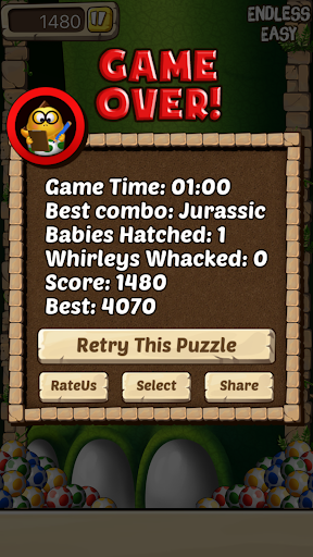 Infinito puzzle Devi sparare alle uova alle uova spinte verso il basso, facendo partite di tre o più, per romperle e farle cadere prima che raggiungano la corda in fondo.Quando la sabbia si esaurisce nella clessidra, la Whirly del dinosauro arriverà a sbattere, cercando di aggiungere un nuovo colore alle uova che rendono più difficile e devi abbatterlo perché non accada