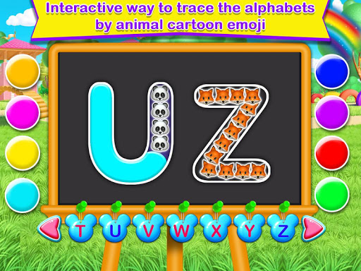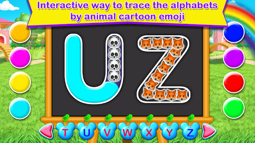 Il tuo bambino impara a scrivere come scrivere alfabeti con l'aiuto della faccia animale emoji e i bambini impareranno lettere per parola e personaggio animato con la visualizzazione colorata come A per Apple.