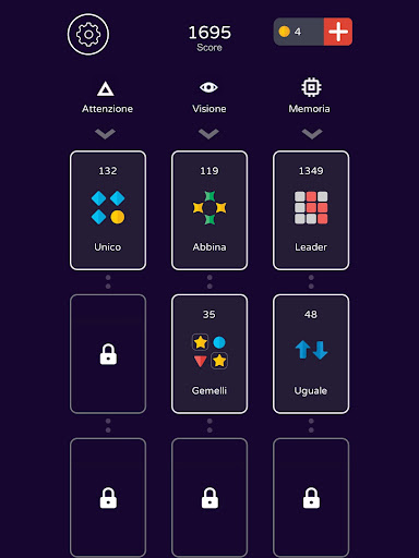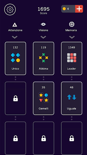 Ogni livello mette alla prova le tue abilità cognitive e le abilità mentali. Puoi seguire i tuoi progressi dopo ogni livello. A seconda della tua performance, puoi ricevere da 1 a 5 stelle. Completando ogni livello con almeno 3 stelle otterrai una moneta d'oro.