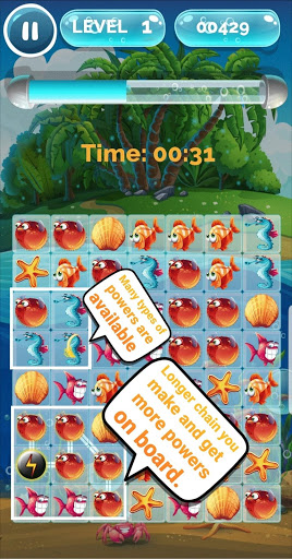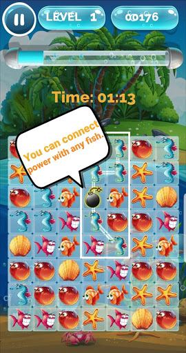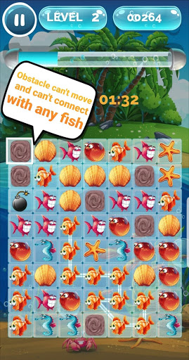 To play Fish World - Fish Connect Drag your finger on same type of fishes and make chain. Longer the chain you could make, more different powers you will get on playing board. You can drag your finger in any direction but only on same types of fishes. Cross chaining is also possible. Power can be matched up with any Fish type, powers are wild. Powers provide great animation and they crush more fishes and pops them out from the board. You can not match, move, crush or pop obstacle because it is obstacle.