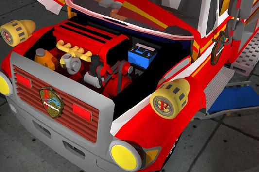Build a fire engine (fire truck / fire apparatus). Paint the firetruck with bright red colors, install the loud sirens, repair the main turntable ladder, upgrade the pump, rescue a cat, and race the truck in a wildfire emergency mission.
