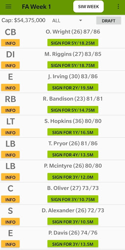 * Sign players in free agency. The game has 5 weeks of free agency and each week the players become cheaper to sign