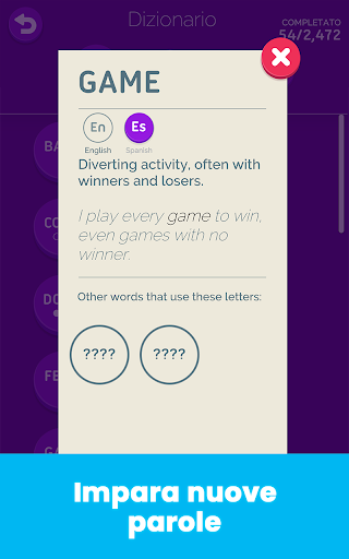 La schermata del dizionario ti aiuterà a imparare nuove parole e migliorare le tue abilità linguistiche. Competi con i tuoi amici per piazzarti in cima alla classifica e guadagnarti il titolo di Campione di Four Letters! Se sei alla ricerca di una sfida personale, ci sono molti obiettivi diversi da sbloccare per monitorare i tuoi progressi.