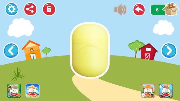 Come play with Eggsy, our friendly egg friend, who has hidden some fruit or vegetables in his eggs, open them up to find out what is hidden inside them.