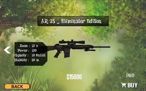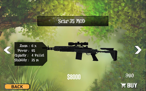 In questo gioco di caccia online gratuito di Android puoi usare molto Di Armi da caccia come: Azione M24-Bolt, Dragunov 2015, Magnum-Hunter Edition, cicatrici 35 mod, Scout SSG 07, Badger-Hunter Rifle e AR 25-Eliminator Edition. Ognuna di quelle armi puoi acquistare per certa quantità di denaro, le pistole che costano di più ti darà uno zoom migliore, più potenza, capacità di munizioni più grandi e una migliore stabilità.