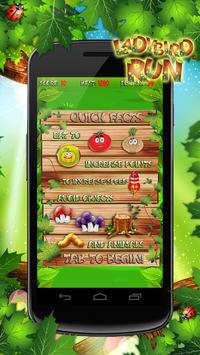 Ladybird Run - un gioco colorato ed emozionante arcade in cui il personaggio principale è coccinella fame. È necessario eseguire una coccinella con una fionda, dandogli la velocità e quindi utilizzando l'accelerometro per controllare da un lato all'altro, cercando di raccogliere quanto più cibo possibile e evitare gli ostacoli: i funghi velenosi e insetti. Il gioco finisce quando si correre oltre la fionda e coccinella si ferma, e se si tocca l'ostacolo. Il gioco sarà in grado di tirarti su il morale in qualsiasi momento.